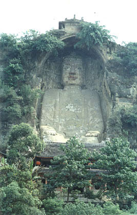 四川荣县大佛,大佛的头顶上方有一道石条卷拱护罩,上刻“大开觉路”四字;崖顶上还有砖阁一座,远看像在戴在大佛头顶上的宝冠。大佛前有阁楼遮盖,以使佛身免遭风雨浸蚀,阁楼也是大佛寺的主体建筑,把大佛从肩部以下遮得严严实实。 >> 详细介绍